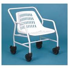 De material plástico duro cuenta con un agujero en el asiento para acceder a el aseo de genitales y ano. Los reposabrazos son abatibles, al igual que los reposapiés. Sus cuatro ruedas hacen que sea fácil moverla y en cada una de ellas cuenta con frenos para evitar que deslice cuando está dentro de la ducha. | Silla de ducha: